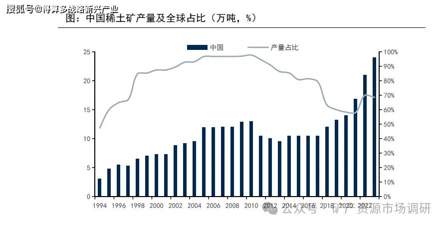 ? 全球稀土礦供應(yīng)變遷,目前我國產(chǎn)量占全球的60%。美國對稀土礦的大規(guī)模開采始于20世紀(jì)50年代,一度是全球最重要的稀土供應(yīng)國。80年代起中國稀土礦產(chǎn)量加速增長,隨著低價(jià)稀土的沖擊,以及美國對生產(chǎn)環(huán)境監(jiān)管的愈發(fā)苛刻,到90年代中國已成為全球稀土供應(yīng)中心。2003年,美國稀土資源開采停滯。到2010年我國稀土礦產(chǎn)量達(dá)13萬噸,占全球總產(chǎn)量的97.7%。為解決國內(nèi)企業(yè)惡性競爭的局面,中國加強(qiáng)和完善了稀土出口管理,并堅(jiān)決打擊非法開采。隨著中國稀土開采管控加強(qiáng)以及海外稀土礦的復(fù)產(chǎn),全球稀土供應(yīng)呈現(xiàn)多元趨勢,其中我國產(chǎn)量占比呈現(xiàn)下降趨勢,近年來穩(wěn)定在60%左右水平,但仍遠(yuǎn)高于儲量占比。