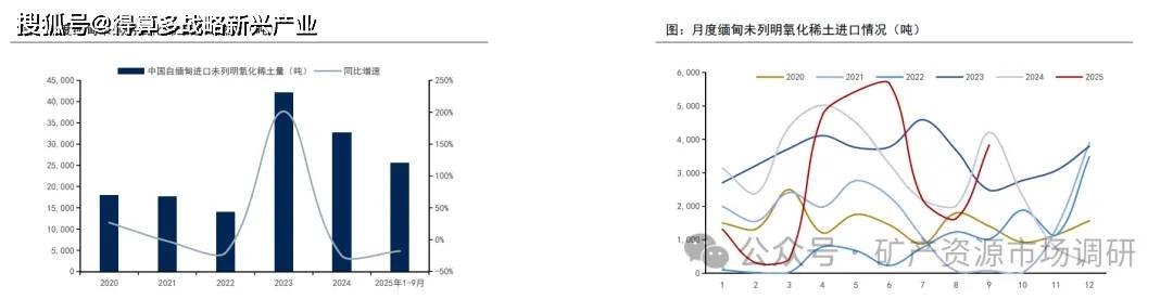 ? 2025年4月緬甸稀土出口恢復(fù)。緬甸是重要的中重稀土供應(yīng)國,2022-2024年中國自緬甸進(jìn)口未列明氧化稀土量分別為1.14/4.17/3.45萬噸。24年10月23日,緬甸因克欽獨(dú)立軍控制礦區(qū)和邊境關(guān)閉而中斷生產(chǎn)和出口,24年11月中國自緬甸進(jìn)口稀土量環(huán)比下滑了67%;12月3日果敢同盟軍宣布在境內(nèi)單方面停火,隨后克欽獨(dú)立軍也表現(xiàn)出通過對話解決沖突的意愿;12月16日中緬邊境口岸重新開放,邊境貿(mào)易恢復(fù),但由于克欽邦的礦商與當(dāng)?shù)卣g利益協(xié)商存在問題,開關(guān)后稀土出口量仍不理想;3月26日,中央財(cái)政部、克欽邦政府聯(lián)合發(fā)布了關(guān)于稀土出關(guān)的通知,自3月27日起東部省開采區(qū)合法開采并庫存已久的稀土將正式出關(guān),參與建設(shè)項(xiàng)目的企業(yè)稅金為3.5萬元/噸,未參與建設(shè)項(xiàng)目的企業(yè)稅金未3.3萬元/噸。據(jù)海關(guān)數(shù)據(jù),今年4月我國自緬甸進(jìn)口未列名氧化稀土數(shù)量為4726.57噸,同比-5.85%,環(huán)比+1002.72%;7-9月分別為2199/1631/3831噸;25年1-9月累計(jì)進(jìn)口量同比下滑18%。
