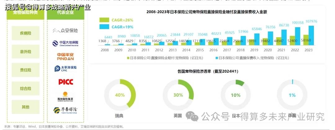 近年來,隨著寵物主養(yǎng)寵觀念的轉變,寵物身份愈發(fā)“擬人化”。在此背景下,作為新興寵物服務中的寵物保險應運而生。目前國內寵物保險主要分為疾病險、意外險、責任險等類別,如眾安保險、大地保險、中國平安等保險公司也已經(jīng)陸續(xù)入局。對比與我國養(yǎng)寵環(huán)境、社會結構等因素最為相似的日本,2008-2023年期間,無論是保險公司側還是寵物主側,都可以發(fā)現(xiàn)寵物保險市場的飛速增長。而從滲透率來看,中國的寵物保險滲透率與頭部國家相比,具有相當大的成長空間。
