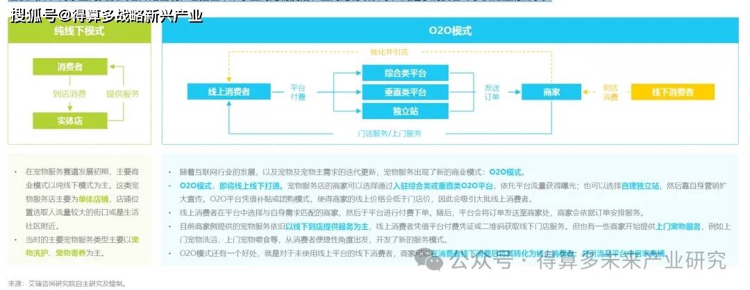 寵物服務賽道發(fā)展初期,大部分商家主要以純線下模式為主,依托地理優(yōu)勢和口碑開展業(yè)務。而隨著互聯(lián)網(wǎng)平臺發(fā)展,O2O模式興起,寵物服務也開始轉型“線上+線下”模式。部分商家會入駐O2O平臺,也有部分商家會自建獨立站。線上消費者在線上渠道獲取商家信息后,于平臺付費并于線下核銷并享受服務。除了消費者到店模式外,商家上門類模式也開始出現(xiàn),包括但不限于上門寵物洗浴、上門寵物喂食等,滿足了消費者對于便捷性的需求。