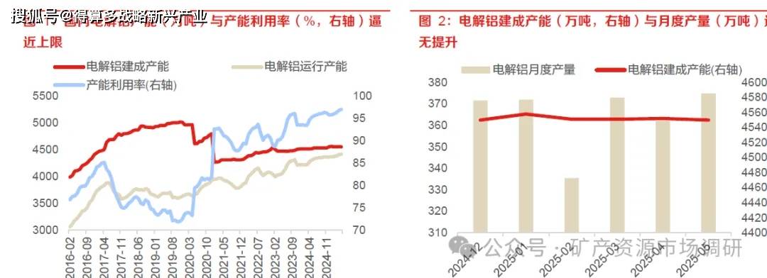 在建電解鋁項目以產能置換為主,實際凈增新產能有限。根據相關公司公告與官網新聞,雙元鋁業(yè)600kA 電解槽10 萬噸產能置換升級項目預計于2025 年9 月投產,通遼市扎哈淖爾35 萬噸綠電鋁項目(扎鋁二期)電解槽于今年6 月19 日順利落槽,2025 年內電解鋁產能較2024 年底總產能增長45 萬噸,增幅約1%。天山鋁業(yè)雖然于6 月7 日公告建設剩余20 萬噸電解鋁指標,但項目建設期暫定為10 個月,預計于2026 年4 月投產,故暫不影響今年電解鋁產能凈增量。其他今年已公告的電解鋁項目如云南宏泰、云南宏合、阿壩鋁廠、東山鋁業(yè)共規(guī)劃產能143 萬噸,均為產能置換項目,不構成凈增產能投放。