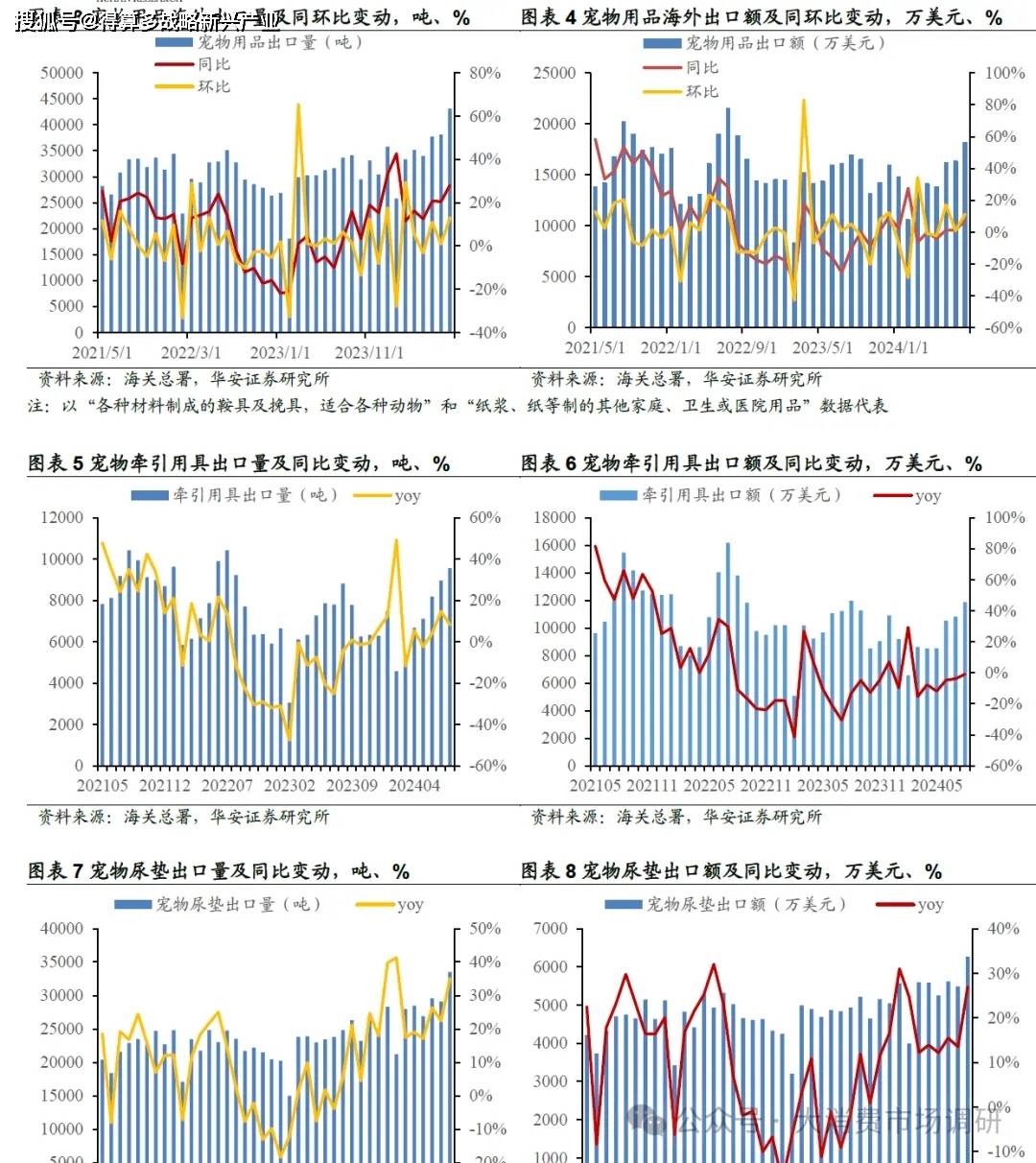 海關(guān)總署數(shù)據(jù):2024年1-8月,我國寵物用品出口量28.32萬噸,同比增長22.1%,寵物用品出口金額11.81億美元,同比增長2.4%,出口均價(jià)同比下滑;其中,1-8月寵物牽引用具(以“各種材料制成的鞍具及挽具,適合各種動(dòng)物”數(shù)據(jù)代表)出口量同比增長7.4%,出口額同比下降5.0%;寵物尿墊(以“紙漿、紙等制的其他家庭、衛(wèi)生或醫(yī)院用品”數(shù)據(jù)代表)出口量同比增長26.5%,出口額同比增長18.3%;2024年8月,寵物用品出口量4.31萬噸,同比增長28.1%,環(huán)比增長13.1%,出口金額1.82億美元,同比增長7.3%,環(huán)比增長11.3%。