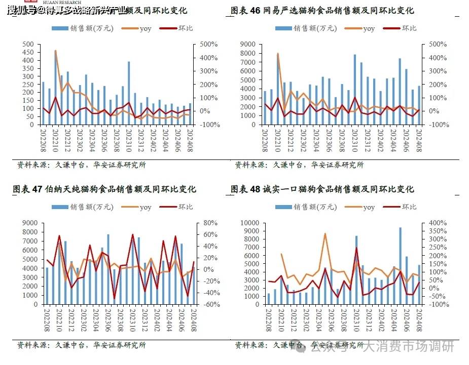 非上市公司品牌方面,2024年1-8月,網(wǎng)易嚴(yán)選品牌貓狗食品銷售金額4.12億元,同比增長22.0%,伯納天純品牌貓狗食品銷售金額3.94億元,同比下滑0.14%,誠實(shí)一口品牌貓狗食品銷售額3.83億元,同比增長85.2%。其中,8月網(wǎng)易嚴(yán)選銷售額0.43億元,同比下降4.3%,伯納天純銷售額0.41億元,同比增長0.28%,誠實(shí)一口銷售額0.48億元,同比增長76.4%。