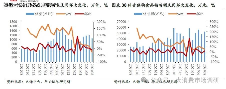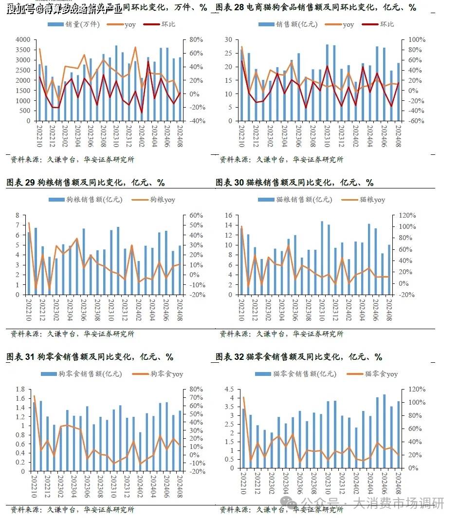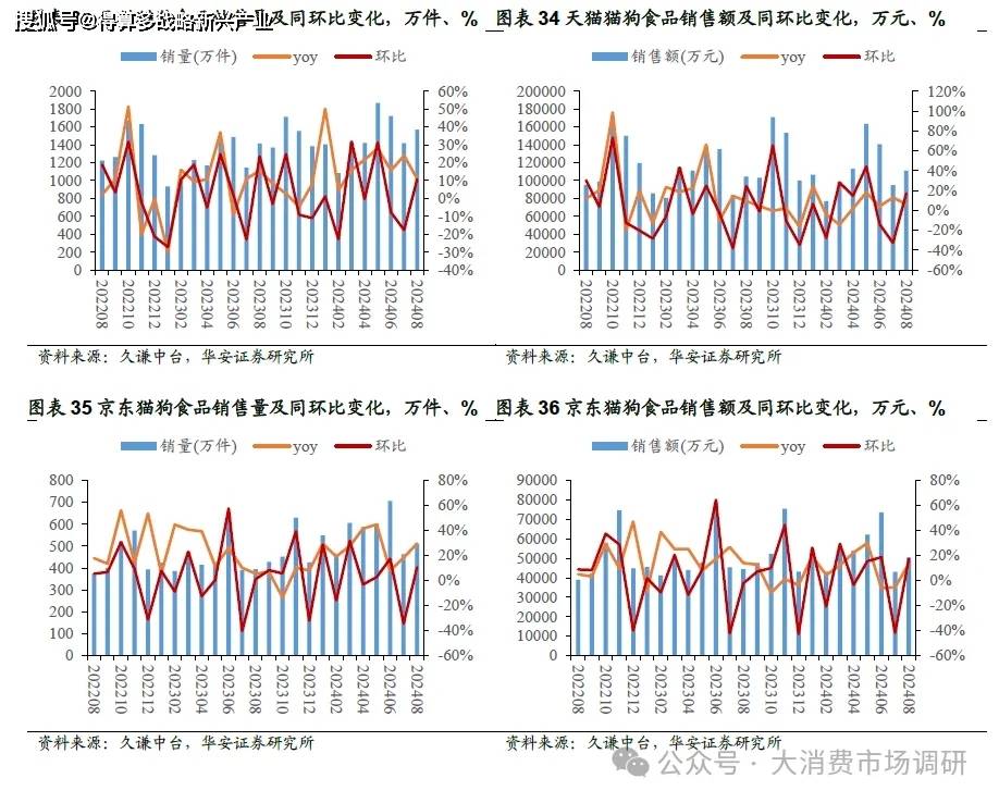 久謙數(shù)據(jù):2024年1-8月,三大電商平臺(tái)(天貓、京東、抖音)寵物品類總銷售額317.9億元,同比增長12.1%,貓狗食品總銷售額171.56億元,同比增長13.3%;受我國寵物貓數(shù)量近年來快速增長影響,貓食品銷量增長尤為明顯,2024年1-8月寵物貓糧和貓零食銷售額分別為84.8億元和27.1億元,同比分別增長17.6%和24.4%;狗糧和狗零食銷售額分別為40.02億元和10.13億元,同比分別增長4.8%和7.5%。2024年8月,三大電商平臺(tái)寵物品類銷售額38.86億元,同比增長5.5%,貓狗食品銷售額21.41億元,同比增長12.1%。