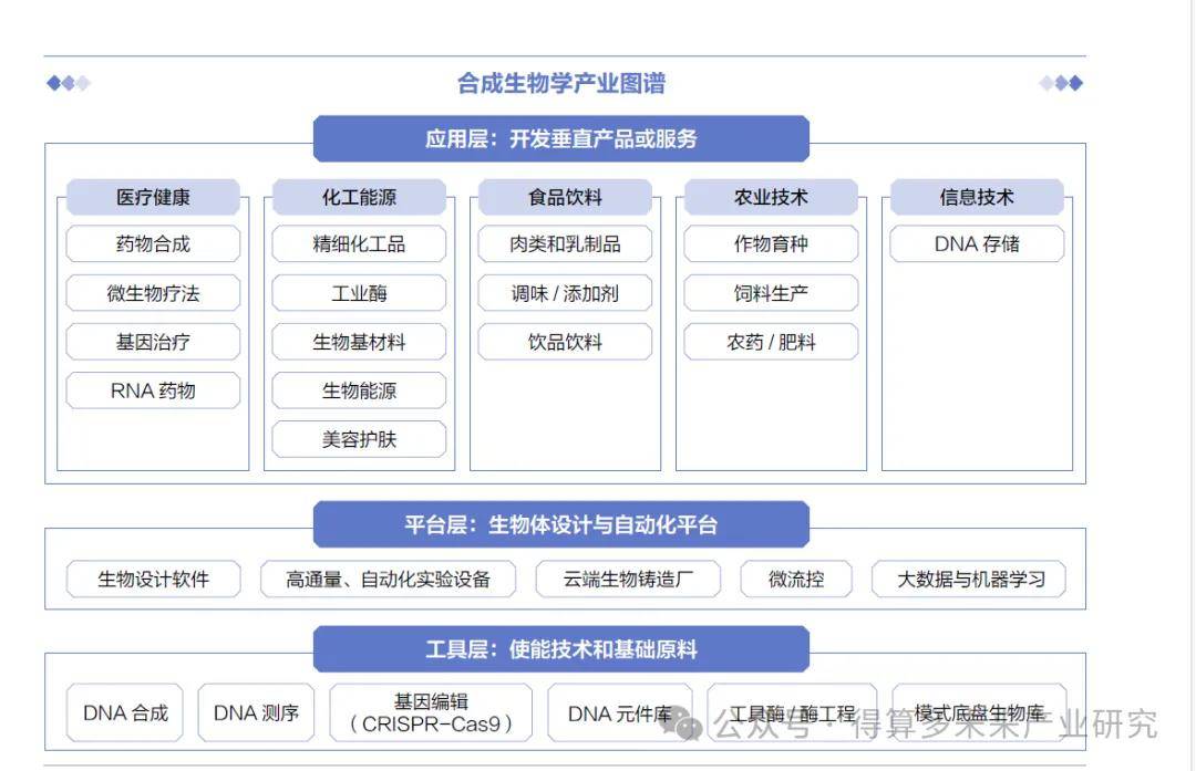 合成生物學(xué)產(chǎn)業(yè)關(guān)鍵環(huán)節(jié)包括菌株設(shè)計(jì)改造、工藝開發(fā)、工業(yè)化量產(chǎn)和終端產(chǎn)品的交付,分為大致的上、中、下游。上游是工具層,負(fù)責(zé)為該行業(yè)提供關(guān)鍵的底層技術(shù)和原料等,如DNA測序、DNA合成、基因編輯、細(xì)胞培養(yǎng)基以及菌株等,這類公司也被稱為技術(shù)賦能公司。中游是平臺層,提供技術(shù)賦能、構(gòu)建平臺型生物,涉及對生物系統(tǒng)和生物體進(jìn)行設(shè)計(jì)、開發(fā)和改造等。下游則是各類產(chǎn)品應(yīng)用型公司,覆蓋范圍廣泛,涉及醫(yī)藥、農(nóng)業(yè)食品、化工能源和信息技術(shù)等領(lǐng)域應(yīng)用和產(chǎn)品落地。