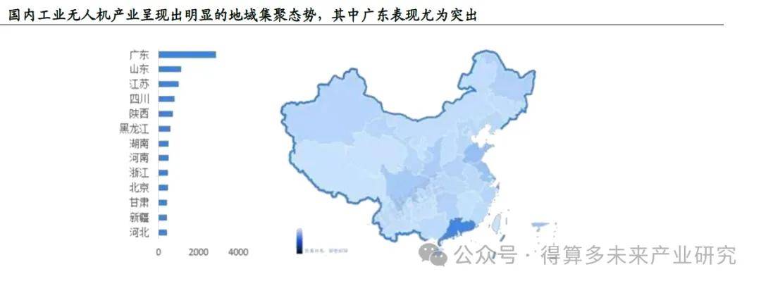 目前國(guó)內(nèi)工業(yè)無(wú)人機(jī)產(chǎn)業(yè)呈現(xiàn)出明顯的地域集聚態(tài)勢(shì),其中廣東表現(xiàn)尤為突出。廣東省通過(guò)“政策引導(dǎo)+產(chǎn)業(yè)鏈集聚+龍頭引領(lǐng)+人才支撐”的多維驅(qū)動(dòng)模式,構(gòu)建了全球領(lǐng)先的工業(yè)無(wú)人機(jī)產(chǎn)業(yè)生態(tài)。截至2023 年,全省工業(yè)無(wú)人機(jī)企業(yè)超2800家,占全國(guó)總數(shù)近三分之一,且仍在持續(xù)增長(zhǎng)。