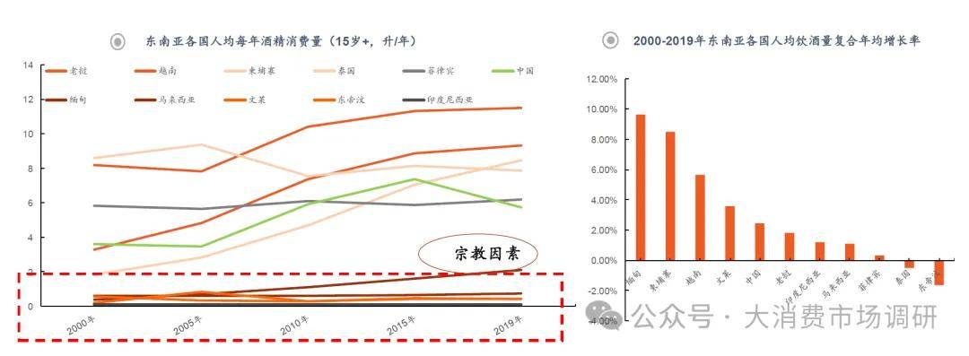 受宗教影響,酒精消費分化:受到宗教因素的影響,東南亞地區(qū)對酒精的政策要求存在差異。印度尼西亞、馬來西亞和文萊主要以伊斯蘭教為主導的,對酒精的管制較為嚴格。據Statista統(tǒng)計數(shù)據顯示,其印尼、文萊和馬來西亞伊斯蘭教人口占比較高,分別為87.20%、78.80%和61.30%,位列前三,對酒精有著嚴格的要求,針對其飲用的場合、年齡和海關中攜帶的數(shù)量和稅收都存在相應的嚴格政策。World atlas公布的數(shù)據顯示,2000-2019年,印尼、文萊以及馬來西亞人均飲酒量在東南亞國家中墊底,人均飲酒量均不足0.5升/年。