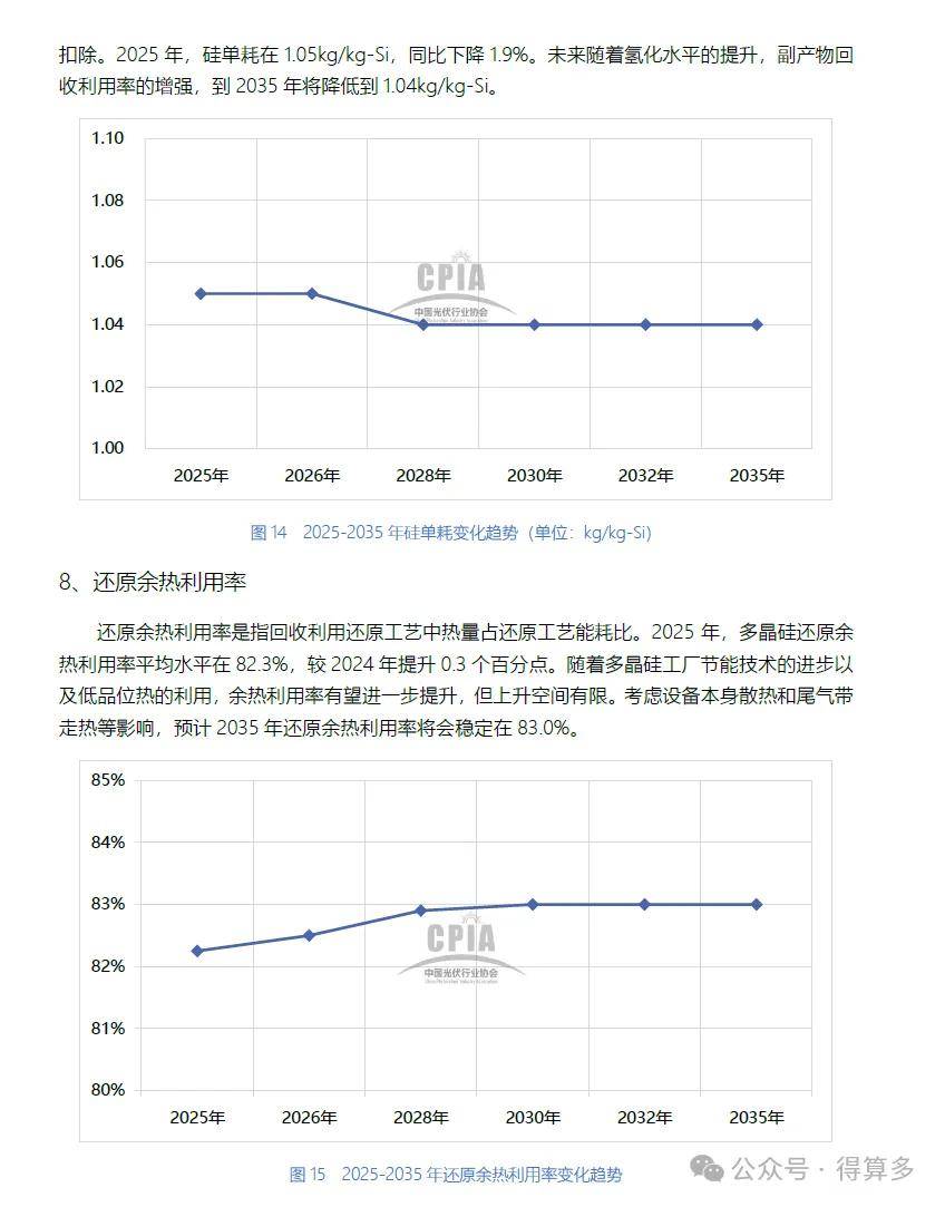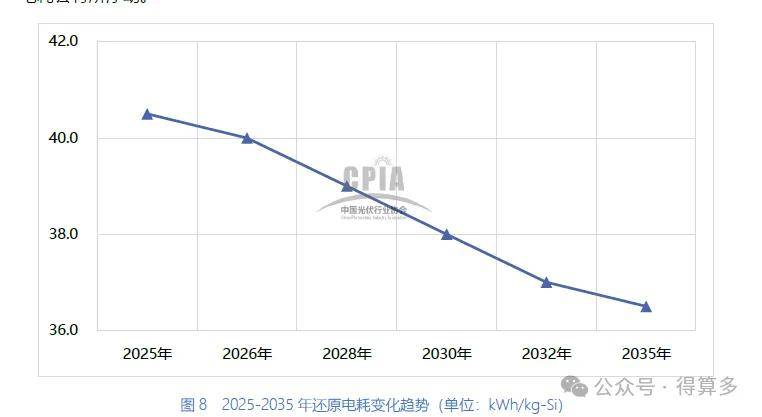 多晶硅還原是指三氯氫硅和氫氣發(fā)生還原反應(yīng)生成高純硅料的過(guò)程,其電耗包括硅芯預(yù)熱、沉積、保溫、結(jié)束換氣等工藝過(guò)程中的電力消耗。2025年隨著還原自動(dòng)化技術(shù)的提升、工藝的進(jìn)一步優(yōu)化、硅芯尺寸的增加等因素,多晶硅還原電耗進(jìn)一步下降,平均還原電耗為40.5kWh/kg-Si,較2024年下降2.4%。未來(lái)隨著還原技術(shù)的進(jìn)步,還原電耗仍將呈現(xiàn)持續(xù)下降趨勢(shì),到2035年還原電耗有望下降至36.5kWh/kg-Si。但有可能隨著下游對(duì)多晶硅產(chǎn)品質(zhì)量的要求變化,還原電耗會(huì)有所浮動(dòng)。