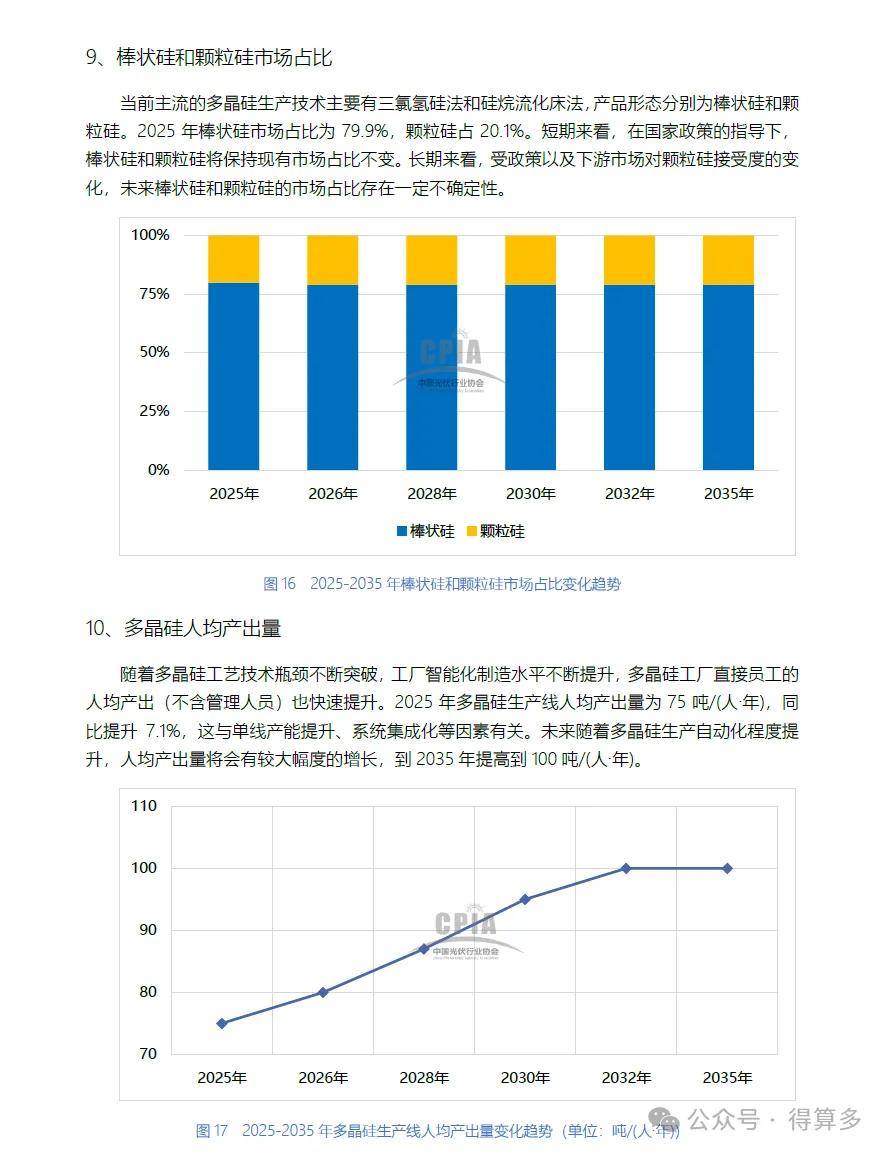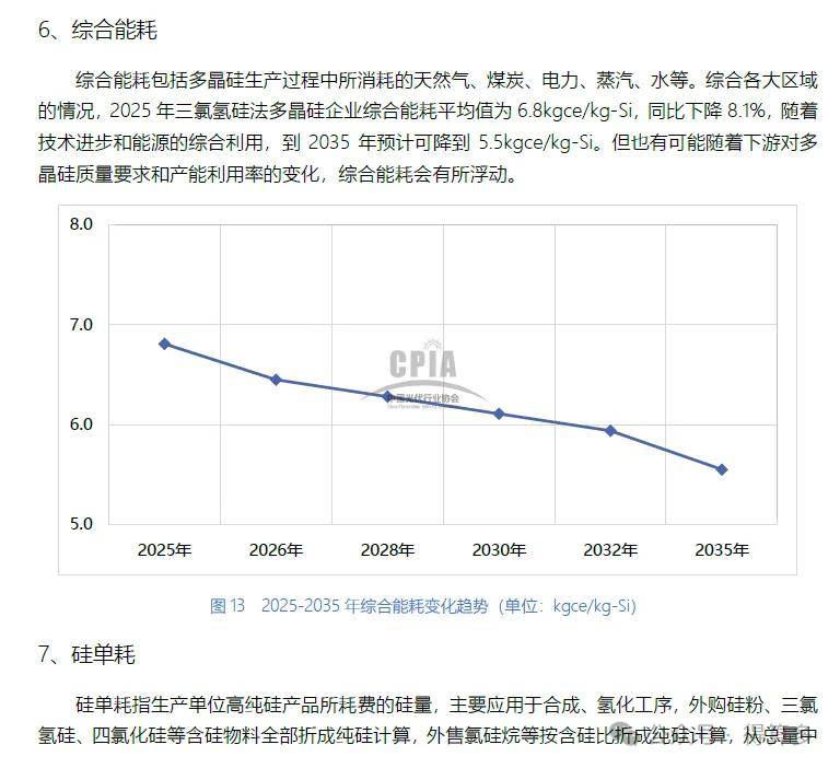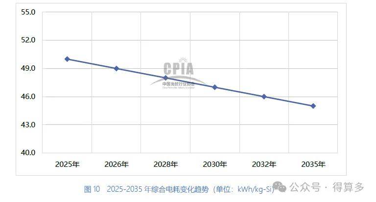 綜合電耗是指工廠生產(chǎn)單位多晶硅產(chǎn)品所耗用的全部電力,包括合成、電解制氫、精餾、還原、尾氣回收和氫化等環(huán)節(jié)的電力消耗。由于各家生產(chǎn)工藝不同,因此綜合電耗有一定差異。2025年,多晶硅平均綜合電耗已降至50.0kWh/kg-Si,同比下降8.3%。未來(lái)隨著生產(chǎn)裝備技術(shù)提升、系統(tǒng)優(yōu)化能力提高、本領(lǐng)域自動(dòng)化智能化技術(shù)能力提升等因素影響,預(yù)計(jì)至2035年綜合電耗有望下降至45.0kWh/kg-Si。目前硅烷流化床法顆粒硅綜合電耗較三氯氫硅法棒狀硅低55%-68%。