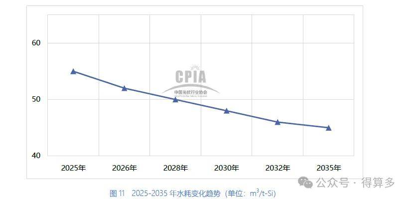 水耗是指生產(chǎn)單位多晶硅產(chǎn)品所需要補(bǔ)充的水量,水的消耗主要包括蒸發(fā)、清洗等。2025年隨著多項(xiàng)節(jié)水技術(shù)的突破,多晶硅單位產(chǎn)品水耗得到進(jìn)一步降低,綜合新疆、內(nèi)蒙、青海、四川、云南等各大廠區(qū)的數(shù)據(jù),多晶硅平均水耗在55.0m3/t-Si,同比下降8.3%。受南北方氣候和水資源差異的影響,用水技術(shù)和裝備有一定的地域差異,如空冷島等技術(shù)在四川等南方地區(qū)適用性較差,導(dǎo)致南北方企業(yè)的水耗差距較大。預(yù)計(jì)到2035年,通過(guò)進(jìn)一步的余熱利用降低蒸發(fā)量、提高渣漿回收率、提高水資源的循環(huán)利用率等措施,可將水耗控制在45.0m3/t-Si的水平。目前硅烷流化床法顆粒硅水耗較三氯氫硅法棒狀硅低30%左右。