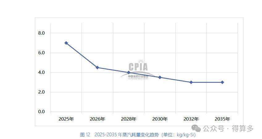蒸汽耗量是指生產(chǎn)單位多晶硅產(chǎn)品外購(gòu)的蒸汽量,不考慮還原爐余熱利用所產(chǎn)生的蒸汽(該能量已通過(guò)電力的形式計(jì)入)。蒸汽的補(bǔ)充主要用于精餾、冷氫化、尾氣回收等環(huán)節(jié),部分企業(yè)已實(shí)現(xiàn)零外購(gòu)蒸汽量。受南北地區(qū)差異以及負(fù)荷波動(dòng)等因素影響,2025年企業(yè)蒸汽耗量均值在7.0kg/kg-Si左右,同比下降9.1%。隨著企業(yè)進(jìn)一步采用提升還原余熱利用率、優(yōu)化物料預(yù)熱系統(tǒng)等技術(shù),2035年企業(yè)蒸汽耗量將降至3.0kg/kg-Si。目前硅烷流化床法顆粒硅蒸汽耗量是三氯氫硅法棒狀硅的3倍左右。