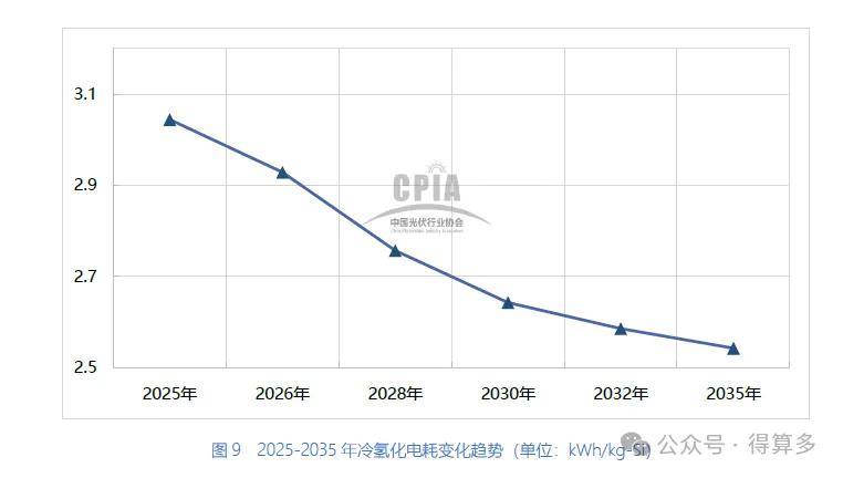 冷氫化技術(shù)是把多晶硅生產(chǎn)過(guò)程中的副產(chǎn)物四氯化硅(SiCl4)轉(zhuǎn)化為三氯氫硅(SiHCI3)的技術(shù),其電耗包括物料供應(yīng)、氫化反應(yīng)系統(tǒng)、冷凝分離系統(tǒng)和初餾系統(tǒng)的電力消耗。各企業(yè)在物料供應(yīng)環(huán)節(jié)使用不同的加熱方式,如電加熱、導(dǎo)熱油加熱、蒸汽加熱、天然氣加熱等。2025年隨著冷氫化工藝的改進(jìn)、系統(tǒng)能量綜合利用等技術(shù)提升,冷氫化平均電耗在3.0kWh/kg-Si左右,同比下降14.3%。未來(lái)技術(shù)進(jìn)步的手段仍包括使用大爐型、開發(fā)新型反應(yīng)催化劑、提高工藝環(huán)節(jié)中熱能回收利用率、提高反應(yīng)效率等,到2035年有望下降至2.5kWh/kg-Si。