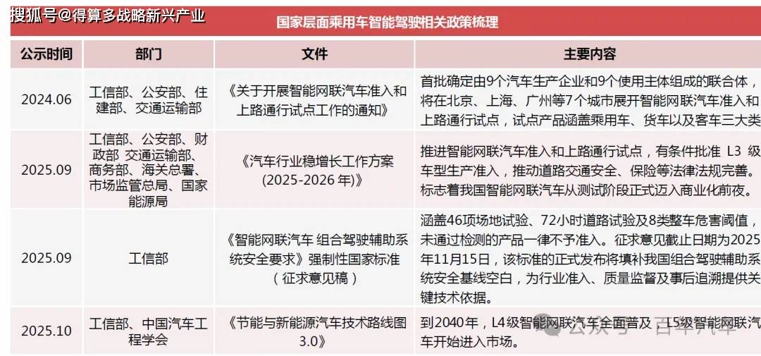 政策端持續(xù)賦能,推動汽車產(chǎn)業(yè)智能化升級。2024年6月,工信部發(fā)布《四部門有序開展智能網(wǎng)聯(lián)汽車準入和上路通行試點》的通知,公布9家首批智能網(wǎng)聯(lián)汽車準入和上路通行試點聯(lián)合體。2025年10月,由工信部指導、中國汽車工程學會組織修訂編制的《節(jié)能與新能源汽車技術(shù)路線圖3.0》提出到2040年,L4級智能網(wǎng)聯(lián)汽車全面普及,L5級智能網(wǎng)聯(lián)汽車開始進入市場。2025年12月,工信部正式公布我國首批L3級有條件自動駕駛車型準入許可。